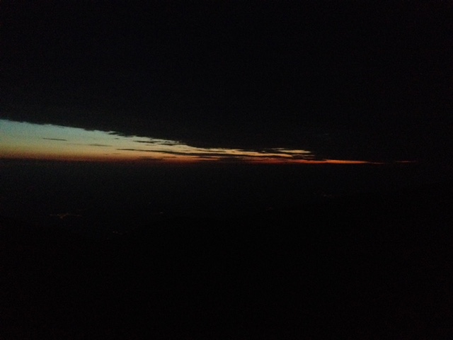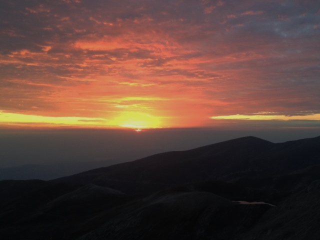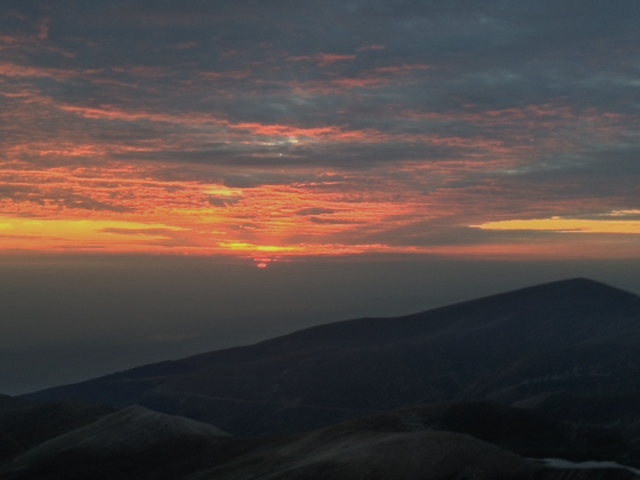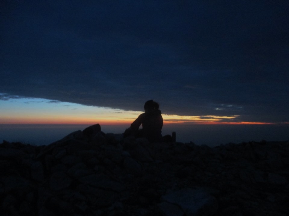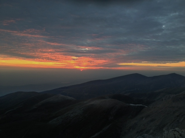Kadıköy’den arabaya bindikten 5 saat sonra, dağın eteklerindeki oteller bölgesinde olduk. 1900 metrede bulunan oteller bölgesine kadar arabayla geldik. Dışarı çıktığımızda hava çok soğuktu, Ağustos sıcağında bunalmış biri için bunu gülümseyen bir ifadeyle yazıyorum, hava buz gibiydi. Üstümüze havaya uygun kıyafetler giyinip, 02:15 de kafa fenerlerimizin aydınlattığı yolda Cem’in rehberliğinde yukarı doğru çıkmaya başladık. Yol hafif rampa, rakımın çok yüksek olmaması ve havanın da yürüyüşe uygun olmasıyla bu rampayı çok kolay çıktık. Yol taşlık ve bilek boyunu geçen bitki örtüsü yok. 1900 metreden 2100 metreye kadar tırmandık. Sonrası düzlük alan ve zirveye çıkmak hiç de insanı yormuyor. Nefesimiz kesilmiyor. Bazen alay ederiz ya dağa çıkarken hayıflanana, “Londra asfaltı mı burası tabii ki yorulacaksın”. İlk kez bu dağa çıkarken evet dedim kendime, Londra asfaltında yürüyorum:) Çok dik çıkmıyoruz, geniş alanda karanlıkta sadece bastığımız yeri görerek ve Cem’e de güvenerek zirveye doğru ilerliyoruz. Amacımız gün doğumunu zirvede yakalamak. Öyle bir kaptırmışız ki saat 05:30 da zirvedeydik, 2543 metre zirveye yaklaşık 3 saatlik yürüyüş sonunda ulaştık. Gökyüzünde perde açılır gibi ince bir aydınlık var. Güneş daha ortada yok, hava soğuk, bekliyoruz.