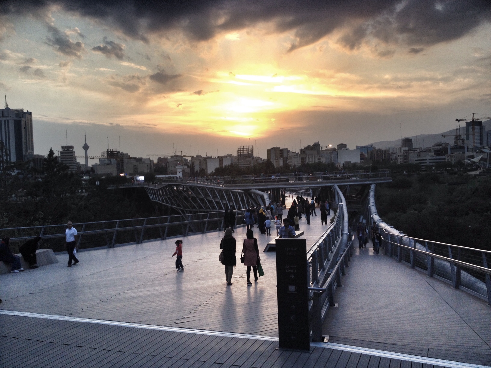 İran’da oldukça geniş parklar bulunmakta. Biz ilk önce Taleghani parkına gittik, burada koşan kız ve erkekleri görebilirsiniz. Yalnız erkekler termal koşu kıyafetleriyle koşarken, kızlar günlük kıyafetlerle koşuyorlar. Hallerinden de hiç şikâyetçi gözükmüyorlar. Bu parkın bitiminde Tabiat köprüsünü de geçince Su ve Ot Parkı bulunmakta. Su olan yerde zamanında gençler burada su tabancası ile birbirleriyle eğlendiklerinde polis gelip duruma el koymuş ve artık çocuklar dışında, herkese bu sulu alan artık yasak. Yasakların kolayca konduğu bir ülke. Gençler kızlı erkekli bir yerlerde eğleniyorsa hemen yasak geliyor. Gece geç vakitte eve döndük.