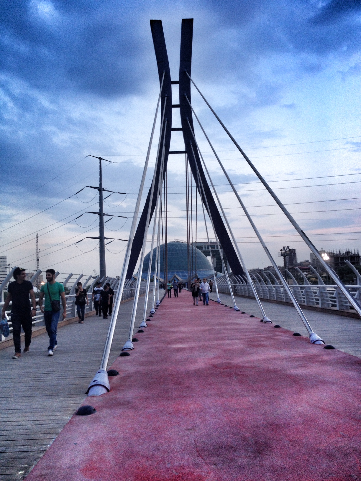 Ertesi gün benimle gelecek bir İranlı arkadaş yoktu, yalnız başıma dışarı çıkayım dedim. Azadi kulesine gitmek için taksiye bindim, Azadi Meydanı’na gitmek için 3000 Tümen yaklaşık 3 TL ödedim. Kuleye girmek için bu sefer turistler için ödenen ücreti ödedim 150 riyal -yaklaşık 15 TL – kulenin altında bir müze var ve burada değerli taşlar ile piyona çalan bir robot bulunmakta. Burası nerdeyse zorla gezdiriliyorJ Bu bölümü gezince asansörlerle yukarı çıkabiliyor ve Tahran şehrini yukarıdan seyrediyorsunuz. Şehir ne kadar renksiz. Çatılar da renksiz olunca, koyu rengin hakim olduğu bir şehir görüyorsunuz. İnsanlar koyu renk giyiniyor, binalar da gri. Durum böyle olunca sizi içine alan, sıcak bir şehirle karşılaşmıyorsunuz.